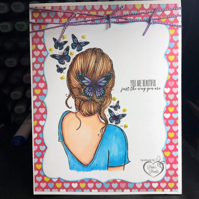 Simply printed and Copic colored, die cut using the Gina Marie Design GM Label 6 cloud like Edged Nested Die Set, with a simple coordinating blue Copic marker line on the edge to add a little depth. I also added the sunshine yellow micro pearls from Gina Marie Designs near the butterfly which coordinated with the hearts in the background paper and added a touch of elegance to the card. The lavender twine webbing at the top completes the card design.